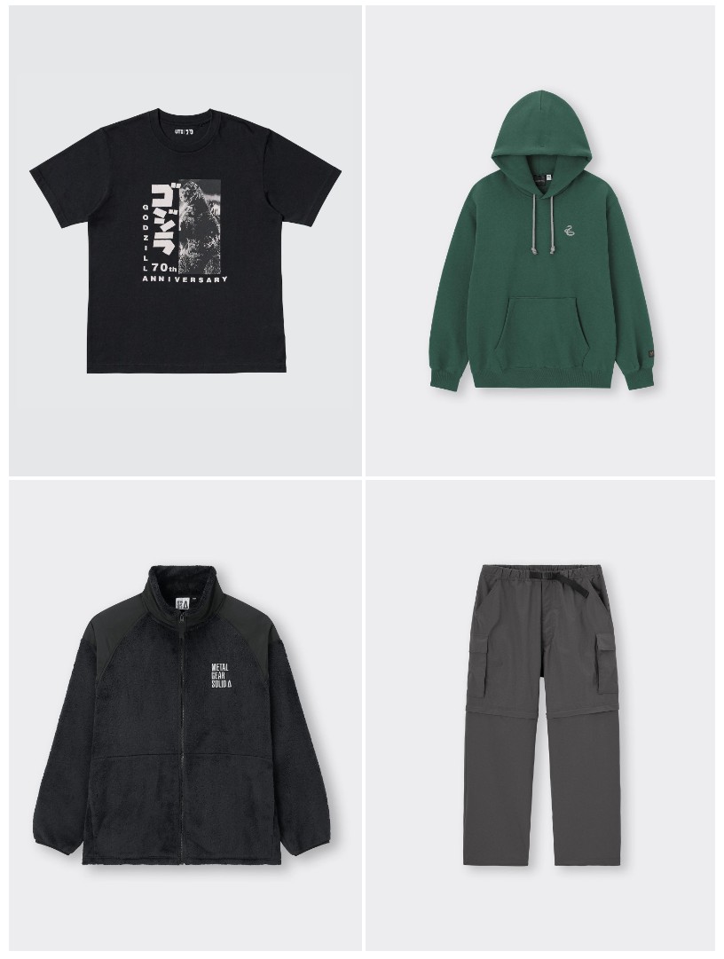 고지라 70주년 기념 UT, GU 해리포터 콜라보 슬리데린 후드티, GU 메탈기어 솔리드 델타 콜라보 플리스, 그리고 GU 카고팬츠를 샀습니다.