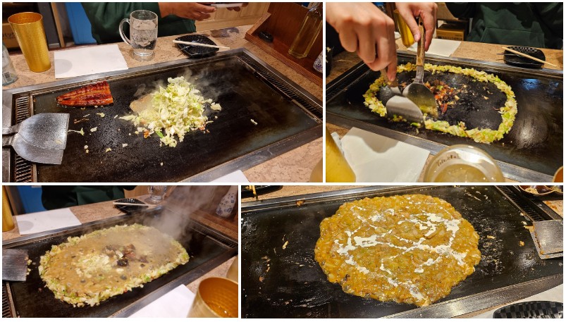 오코노미야키와는 다르게 양배추로 담을 세운 뒤 질척한 전분물을 부어서 부쳐먹는 요리.